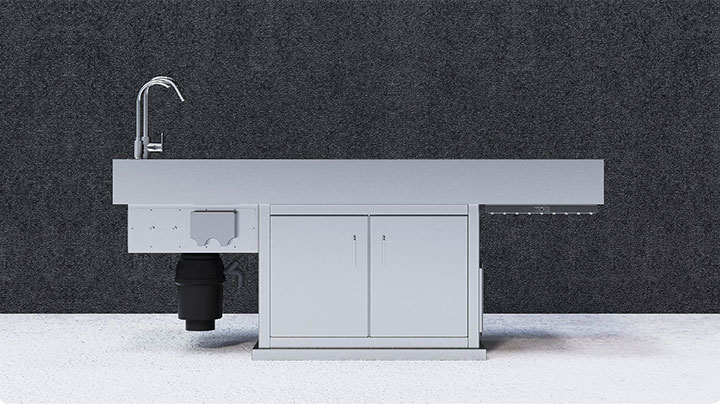 | 水池下方配有碎骨机,可粉碎解剖后的动物组织(较小的组织),并通过排水口排出 | |